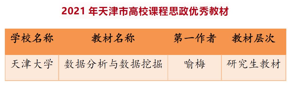 (通讯员 葛惠莹)近日,天津市教育委员会发布了《关于公布天津市高校课程思政示范课程、教学名师和团队、优秀教材评审结果的通知》,免费成人影片 喻梅老师为第一作者的《数据分析与数据挖掘》获评首批天津市高校课程思政优秀教材。