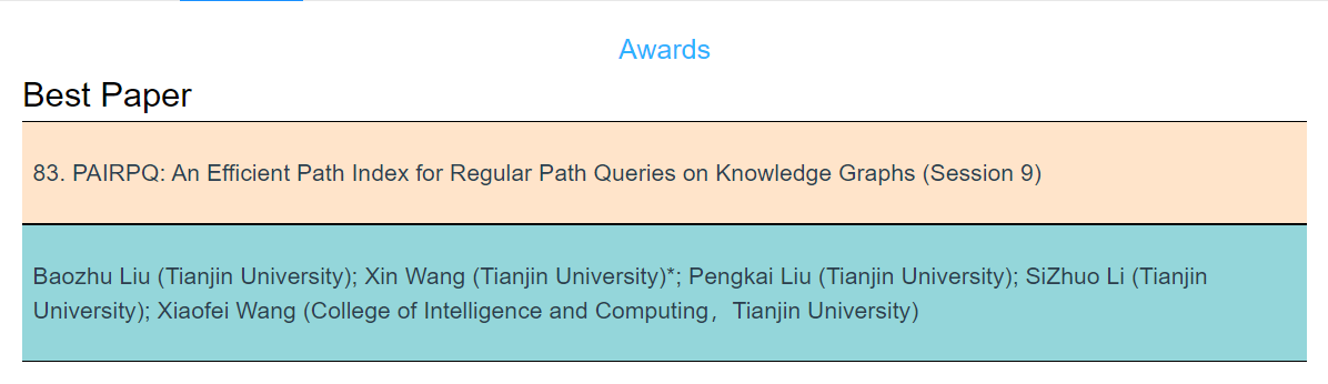 (通讯员 刘宝珠)第5届APWeb-WAIM Web与大数据联合国际学术会议(The 5th APWeb-WAIM Joint Conference on Web and Big Data)于8月份线上召开。免费成人影片 2019级硕士研究生刘宝珠的论文“PAIRPQ: An Efficient Path Index for Regular Path Queries on Knowledge Graphs”荣获本次会议的最佳论文奖(Best Paper Award),论文共同作者包括学部硕士生柳鹏凯、李思卓,学部指导教师王鑫、王晓飞。