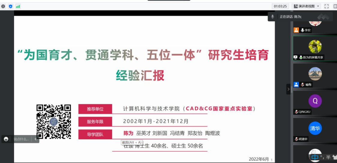 陈为教授通过“为国育才、贯通学科、五位一体”的研究生培育经验汇报,与大家分享了二十年来从事教学科研的历程。首先,陈为教授介绍了团队的学科背景、导学团队、使命愿景;其次,从党建育人、科教协同育人、产学研竞训五位一体育人等三个角度阐述了研究生育人的经验;最后,通过人才培养、教育教学、学科发展、国际影响四个方面展现了研究生教育的突出成效。